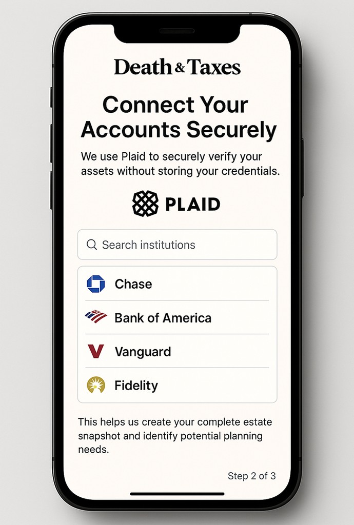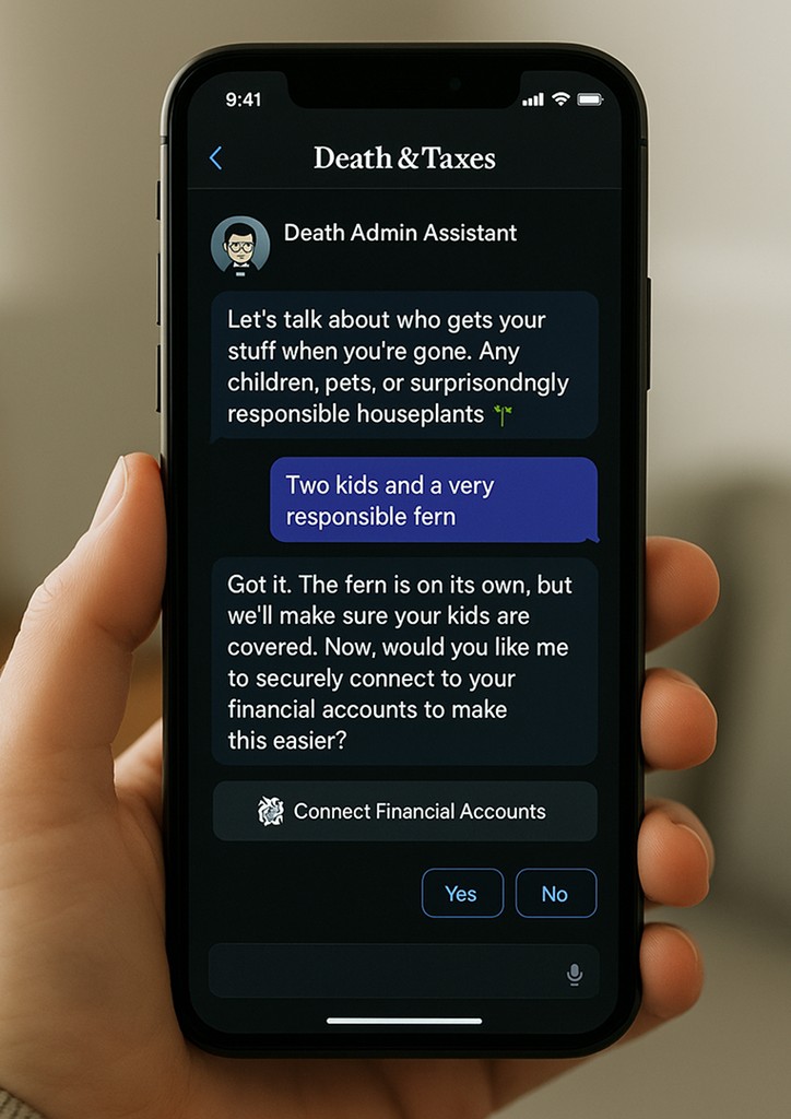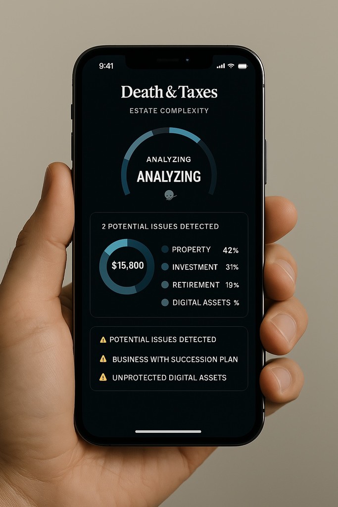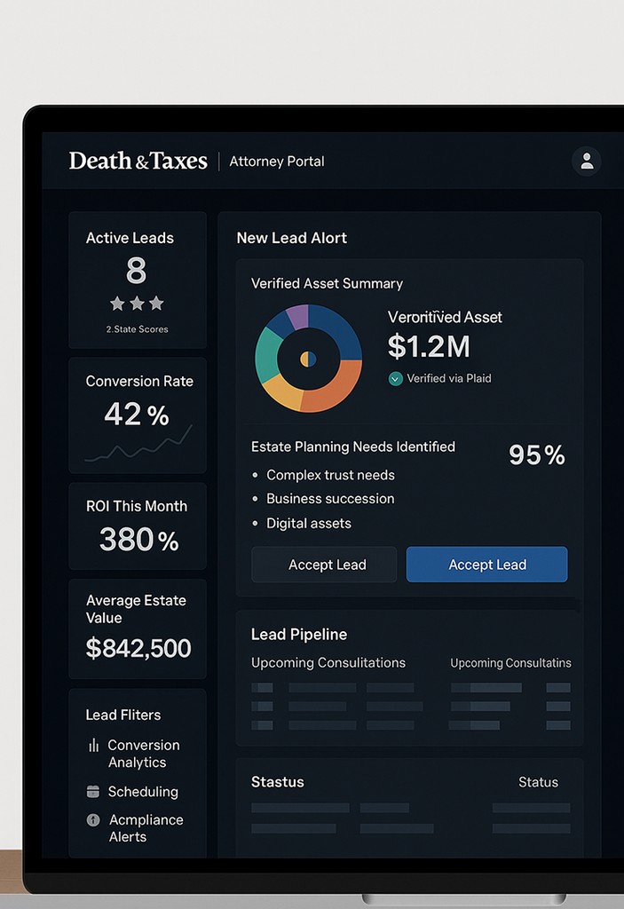 We've built a platform that transforms estate planning from a dreaded chore into a streamlined digital experience. By combining AI compliance technology, financial data integration, and humor-based UX, Death & Taxes creates qualified leads for attorneys while solving the estate planning avoidance problem that affects 58% of Americans.